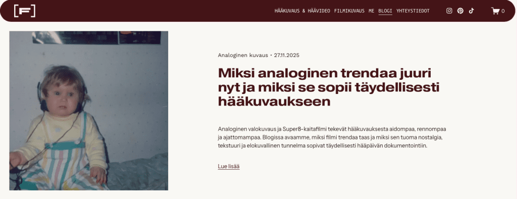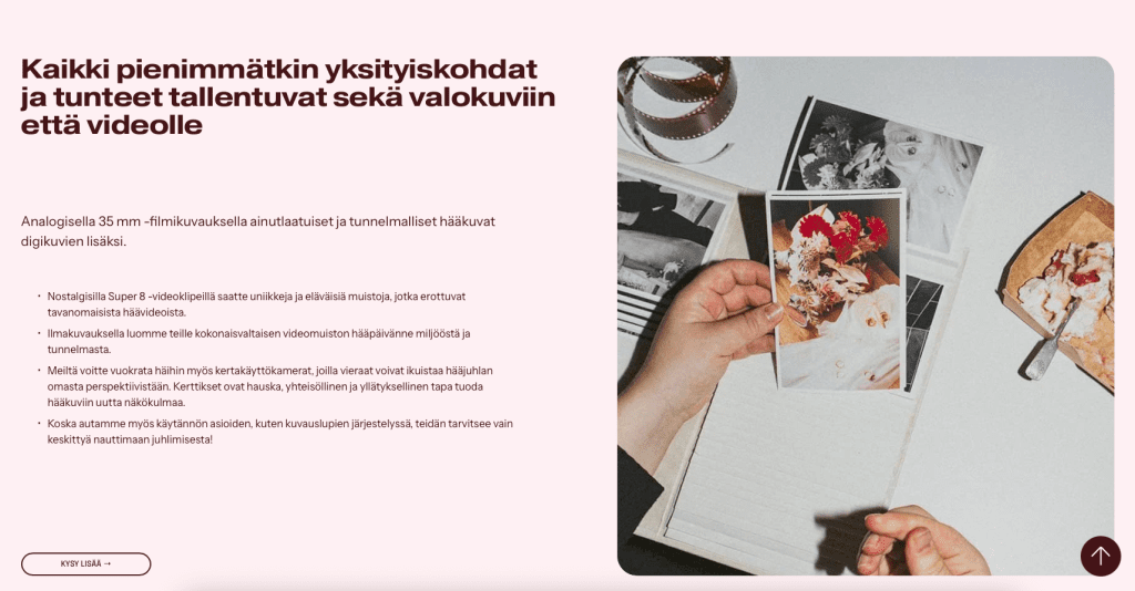 Tulin mukaan Filmillä Oy:n verkkosivujen uudistukseen, kun sisällöt kaipasivat tuoretta katsetta, ja tekstejä haluttiin kehittää ja yhtenäistää brändiä vastaavaksi. Kävimme yhdessä läpi verkkosivujen eri sivujen sisällöt ja varmistimme, että kaikki toivotut asiat tulevat niissä esiin. Määrittelimme brändin äänensävyn ja viilasimme tekstit sen mukaisiksi.